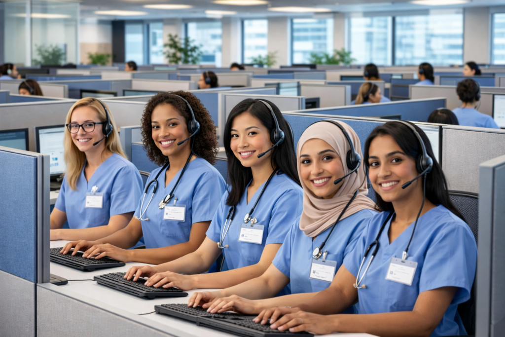 All professionals undergo structured training in U.S. healthcare workflows, medical terminology, HIPAA compliance, electronic health record systems, and communication standards.